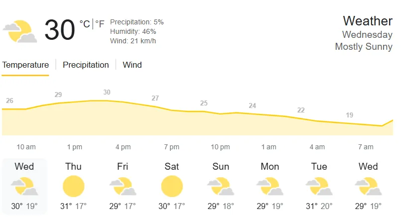 The temperature in the afternoon at the time of the game’s start will be 31 degrees Celsius with a bright and sunny day. The temperature will lower during the first half of the game before dropping to 25 degrees Celsius in the second innings. However, the humidity around the start of the game will be 53% which will further increase to 61% in the evening. The sky will be bright and sunny throughout the first half of the game, with 10% cloud cover in the afternoon, getting reduced to only 3% cloud cover in the evening.